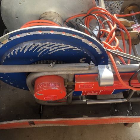 This is the second of the Pluto winches. It has had its optical fibre cable removed leaving only the optical fibre converter/commutator in the hub. Measurements suggest it will accept 1500m of 4 core cable readily. See notes on the ‘Winch 700m 4 core’ for other details.