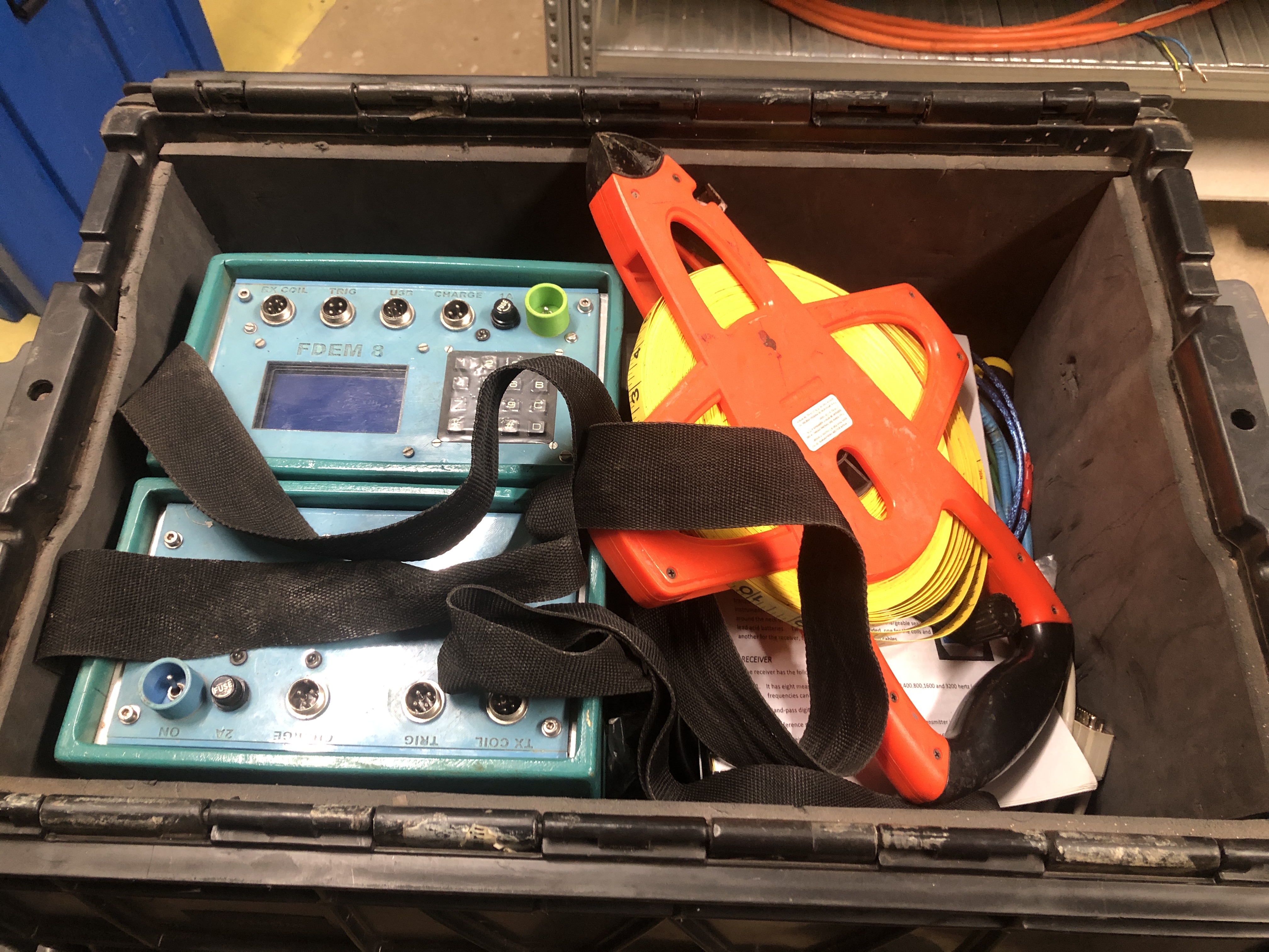 Red Dog DT Barlow’s FDEM8 is a deeper imaging FDEM tool made in South Africa. It runs on a Raspberry Pi type of board and is certainly a low cost instrument. Two persons walk with coils, one transmitting and one receiving and can image metres to tens of metres deep. Readings are taken while stopped, sweeping through a range of 8 frequencies in about 15 seconds at each location to attempt to image to different depths. Coils are separated typically by at least 10m. We have this instrument in stock, 2nd hand.
