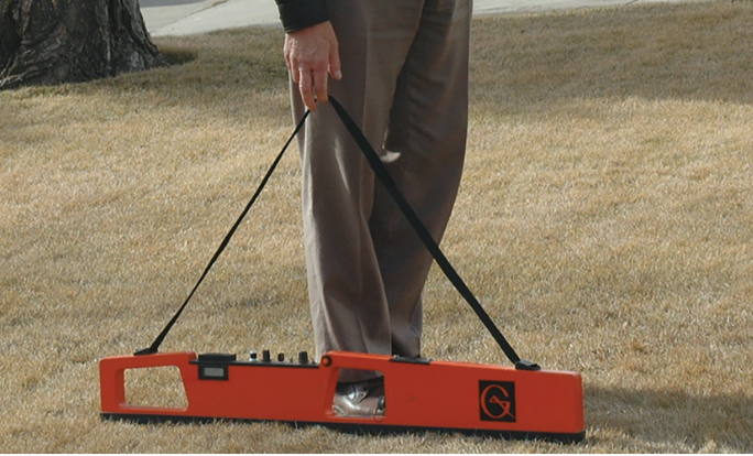 The Geonics EM38 bulk soil Electrical Conductivity meter is a 1m long frequency domain electromagnetic mapping tool used in conjunction with a logger and GNSS receiver. It can be hand carried as shown, towed in a sled behind a quadbike, mounted to farm machinery with innovative design, or rolled along in a single wheeled walked trailer. This device has been around for many decades, early versions being hand made of wood.