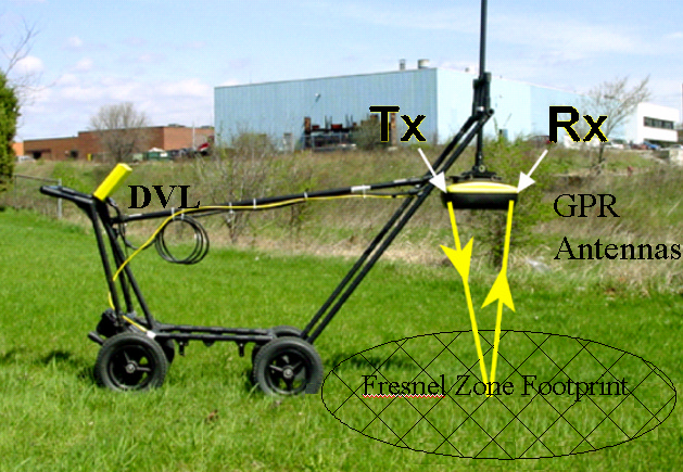 We own a 250MHz, Canadian Sensors and Software, Ground Penetrating Radar (GPR) along with a cart for rolling it across the ground. In less saline ground it finds pipes, metal, disturbance in soil and various soil profile boundaries. It detects concrete reinforcement bars yet a 500 to 1000 MHz GPR is better for such applications. GPS data can be collected with the GPR data to make time slice maps and other presentation products for superimposing on air-photos.