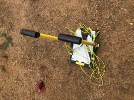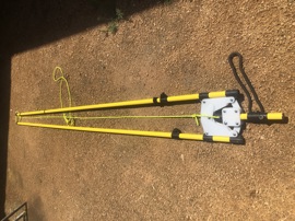 The annotated phot presents an overview of some of the configurable parts of the Wallaroo system. The second photo reveals its slingram configuration propelled by an electric tractor.